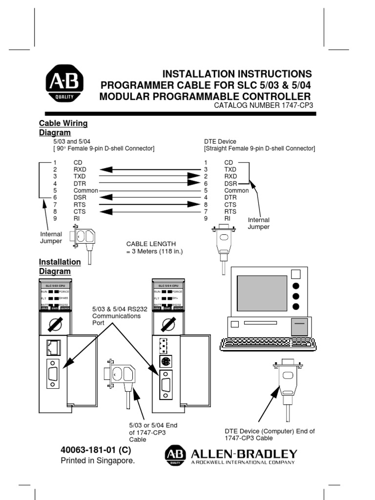 The allen bradley 1747 cp3 is a programmer cable for the slc 5 03 and the 5 04 modular programmable controllers.