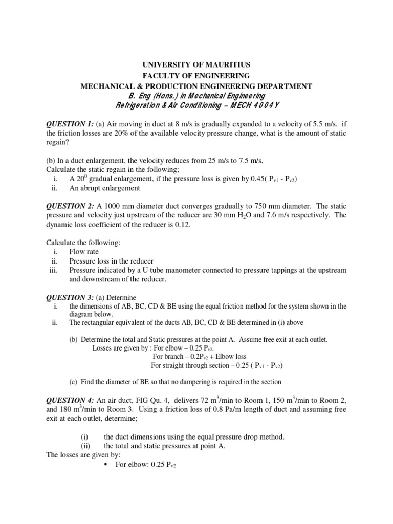 University Of Mauritius Faculty Of Engineering Mechanical Production Engineering Department Duct Flow Physics Mathematics